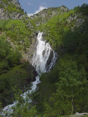 Voor eerst in deze vakantie starten we met een volle maag. Vandaag hoeven we alleen nog maar bergaf te lopen. Het is nog steeds warm weer. Ook nu lopen we weer fout en moeten een riviertje oversteken. Omdat de zolen van mijn bergschoenen er bijna af liggen en derhalve met tape bij elkaar worden gehouden, loop ik door de rivier met bepakking en mijn schoenen aan. Voor ik het weet sta ik tot mijn middel in het water. Franz gaat op blote voeten, maar omdat hij altijd geluk heeft en zich verstapt, schept hij alsnog zijn schoenen vol met water. Zonder leedvermaak hebben wij aandachtig gekeken naar Franz zijn pech. Even later pikken we de route weer op en steken met een bruggetje de rivier voor de tweede keer over. We hadden helemaal niet hoeven oversteken dus ik loop voor niets in mijn schoenen te soppen.